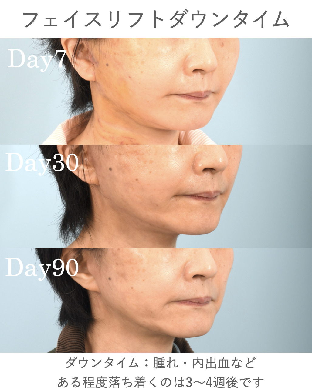 腫れや内出血(生じた場合)がある程度目立たないくらいまで落ち着くのは3〜4週間です。