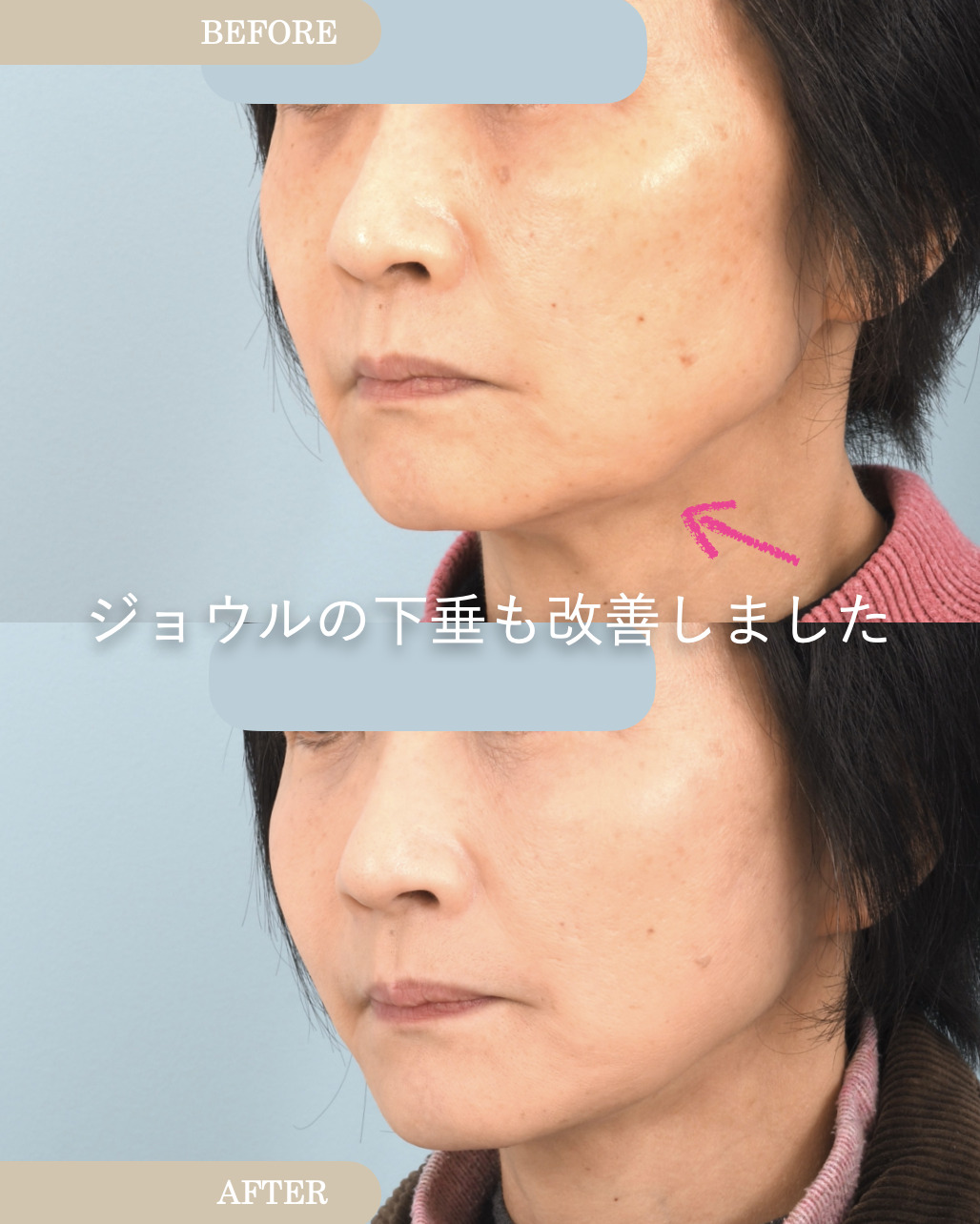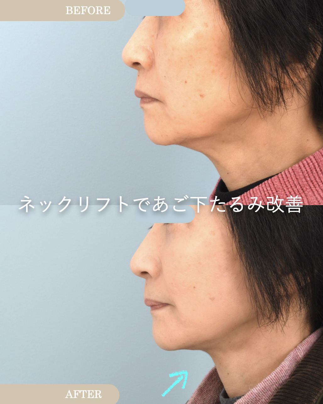 本症例ではあご下のたるみも中等度認めたため《ネックリフト》としてあご下の脂肪吸引、広頚筋の縫合(=ペリカン手術、筋肉しばり)、広頚筋の引きあげを同時におこなっています。首と顔の境目がはっきりすることで若々しい印象をとりもどします。