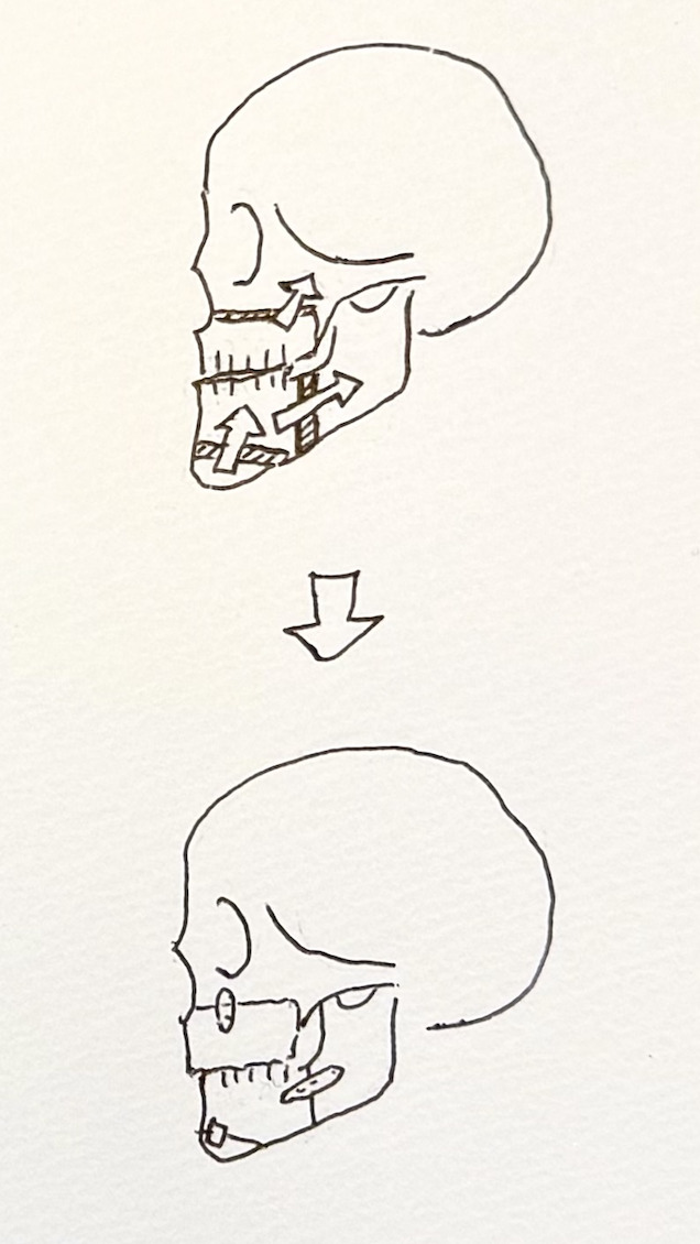 手術の内容:上下顎骨切り術(時計回転)+オトガイ形成(4㎜中抜き)