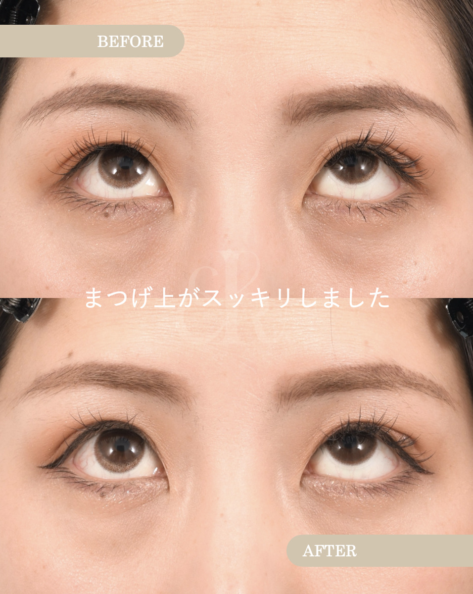 もともとまつげが眼球に当たるような「重度のさかまつげ」の状態ではありませんでしたが、まつげが皮膚にあたってかるく押されています。まぶたのきわの皮膚が余ってもたついた感じもありました。20代なので加齢による「たるみ」ではありませんが、もともとの皮膚の余り感がたるみのように見えている状態でした。