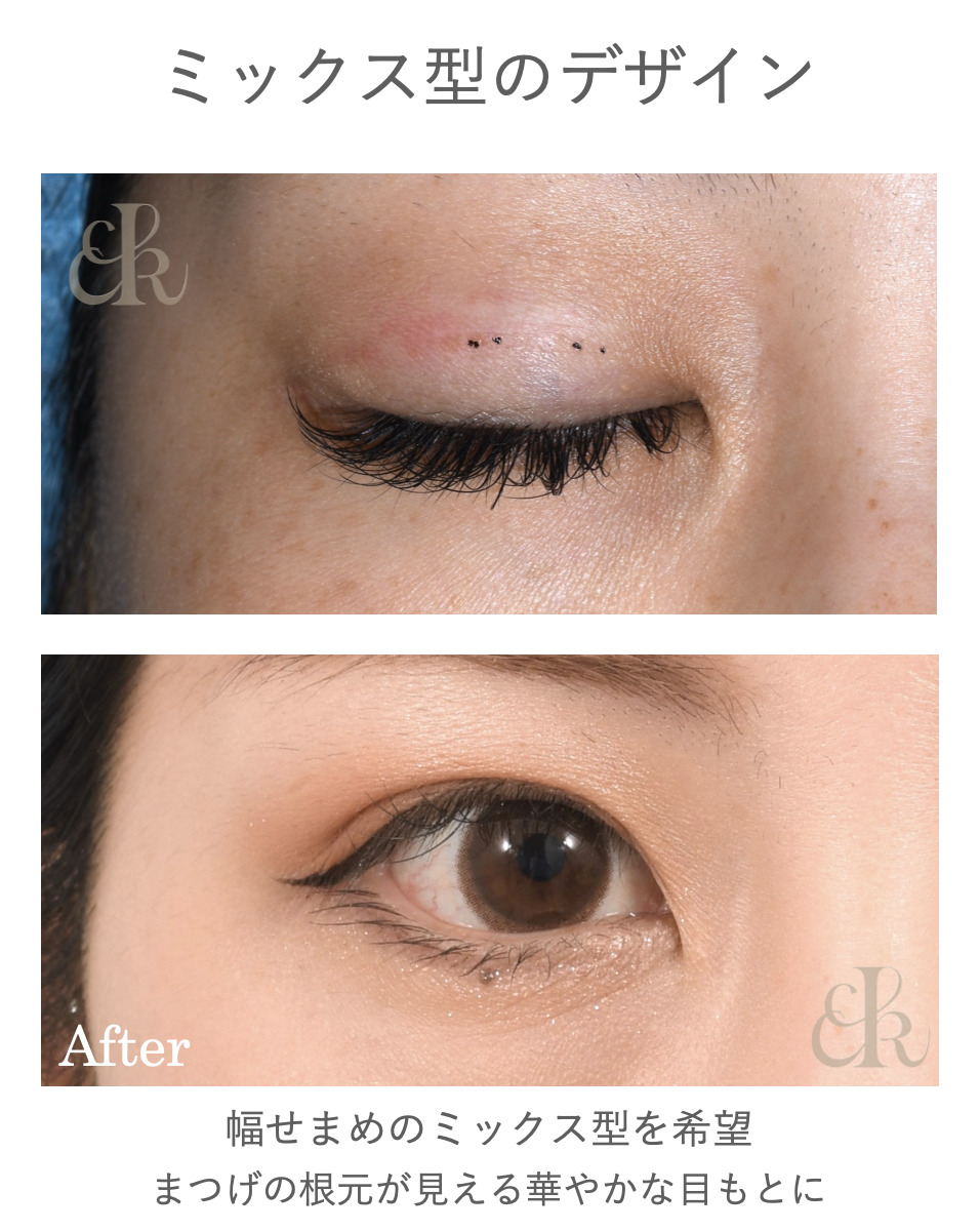 幅せまめのミックス型を希望されていました。希望通りの形態になっています。まつげの根元が見えるようになり、目も大きく華やかな印象になりました。