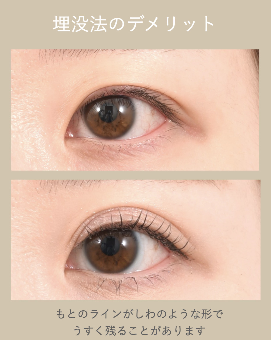 埋没法のデメリットはもともとの二重ラインが薄く残ることがあるという点です。しわのような形で残るラインが気になる場合には切開法をご検討ください。