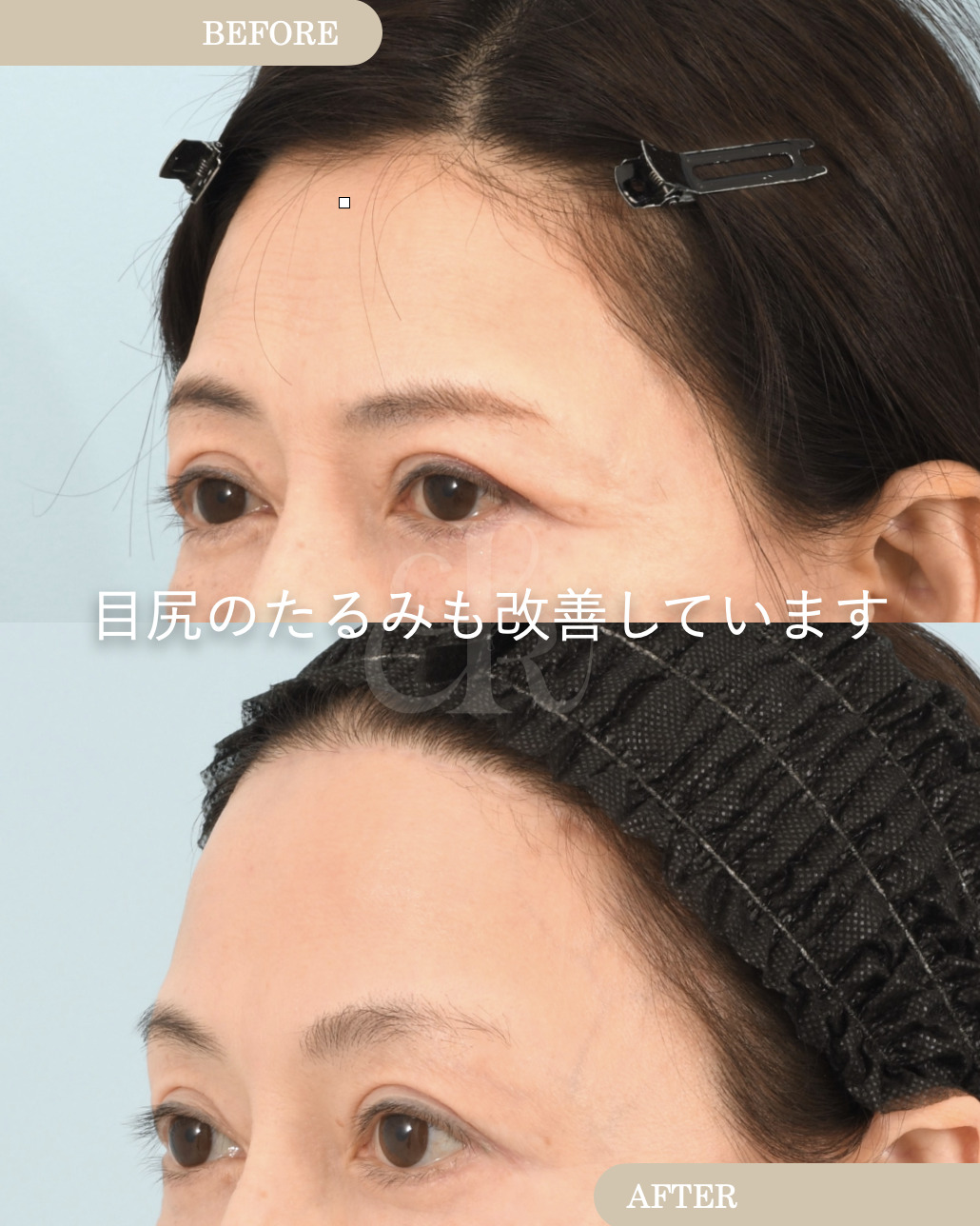術後は全体が引き上がったことで目の重さが解消され、目尻のたるみも改善しています。