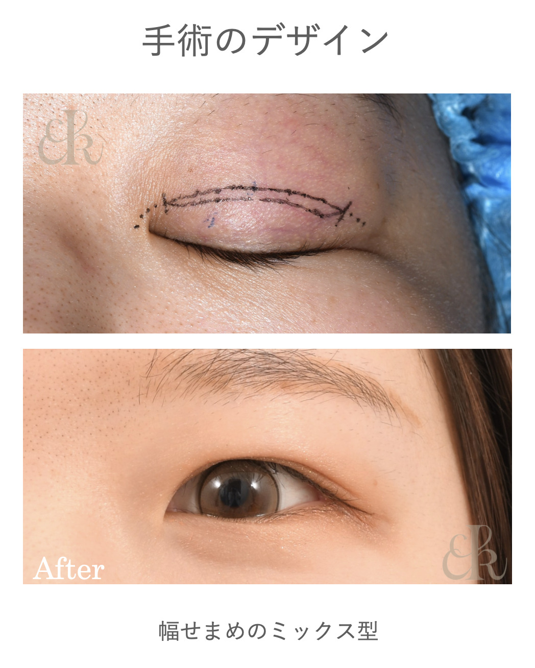 もうこひだのつっぱりはそれほどなく、目頭切開はせずにミックス型(中間型)になるようデザインしました。デザインの画像で目頭側、目尻側にある点線部分は皮膚を切開せずに皮下のボリュームだけを減量する処置をしています。これによって切開した部分だけがくっきりふたえになり内側、外側で急に二重線が途絶えるという不自然な形になることを避けることができます。ある程度以上の厚みのあるまぶたでは必須の処置です。