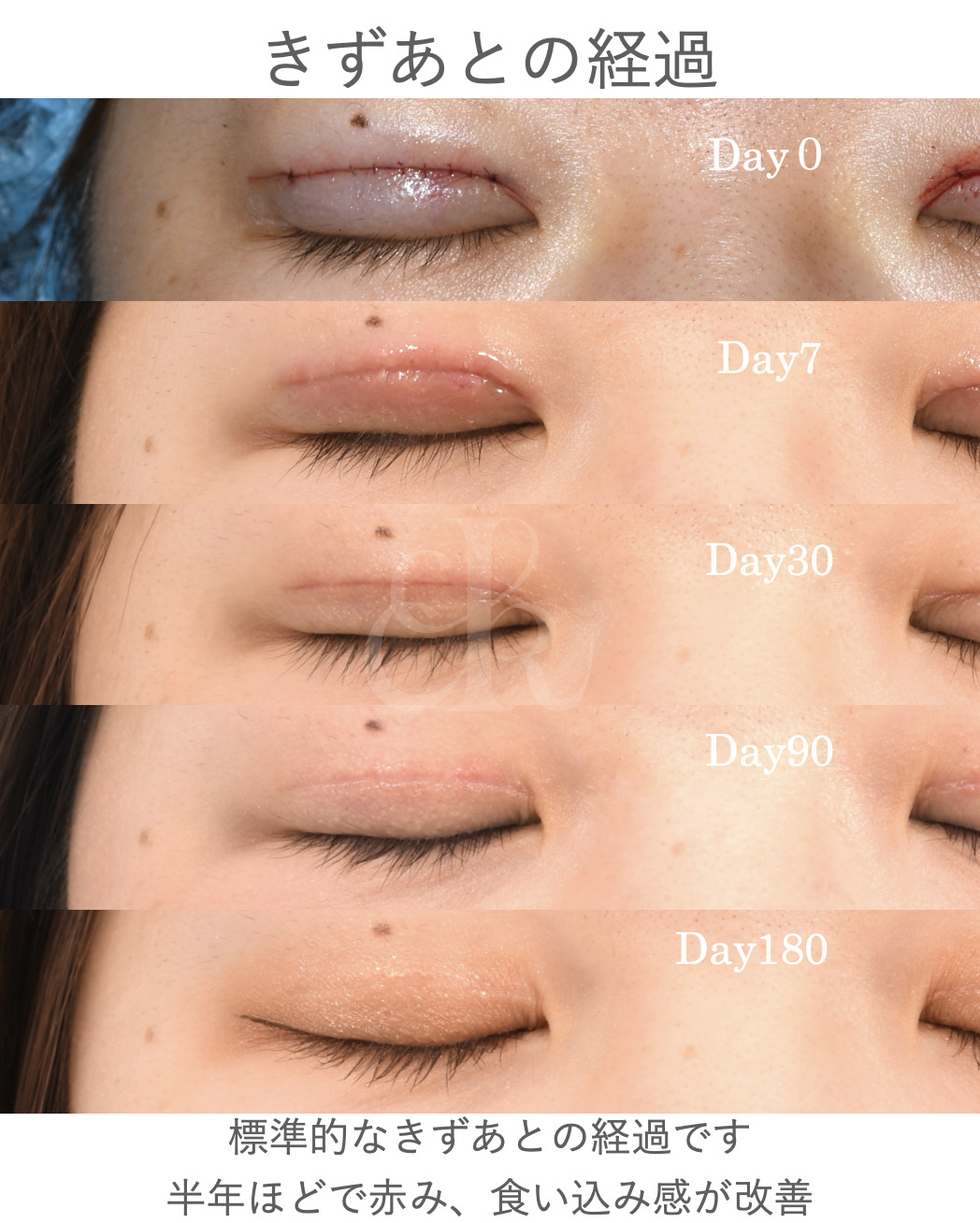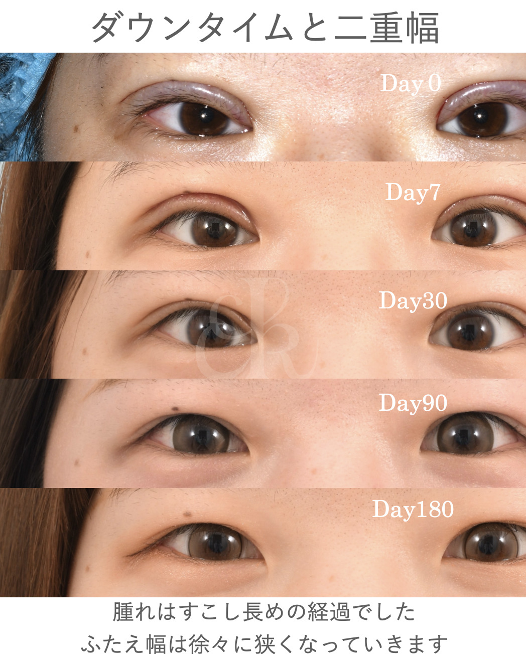 ・腫れには個人差がありますが、通常ピークは1、2日目です。完全に落ち着くまで2〜3ヶ月かかることがあります。腫れている間は、重瞼幅(ふたえの幅)が広く見えます。