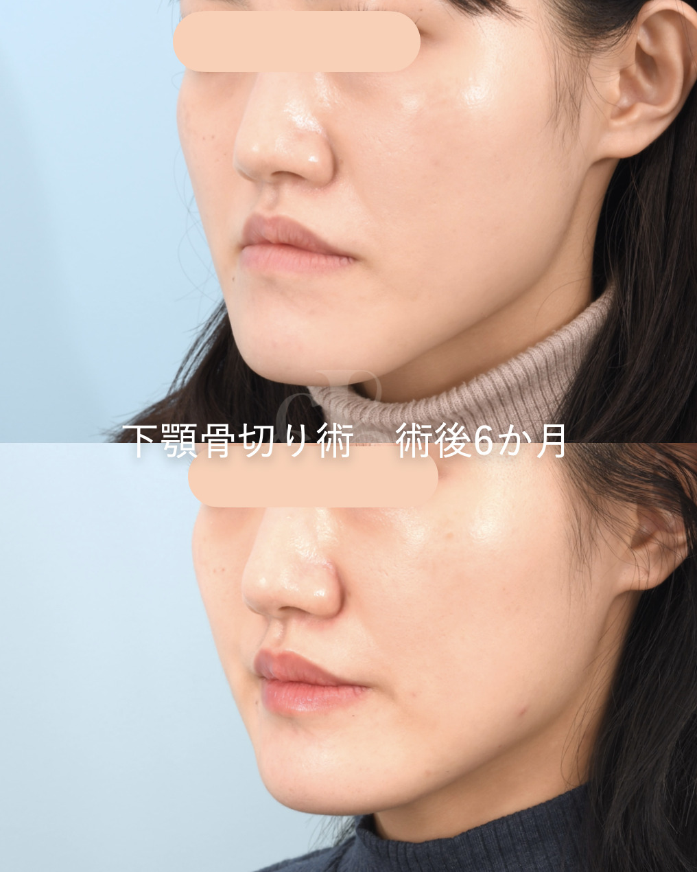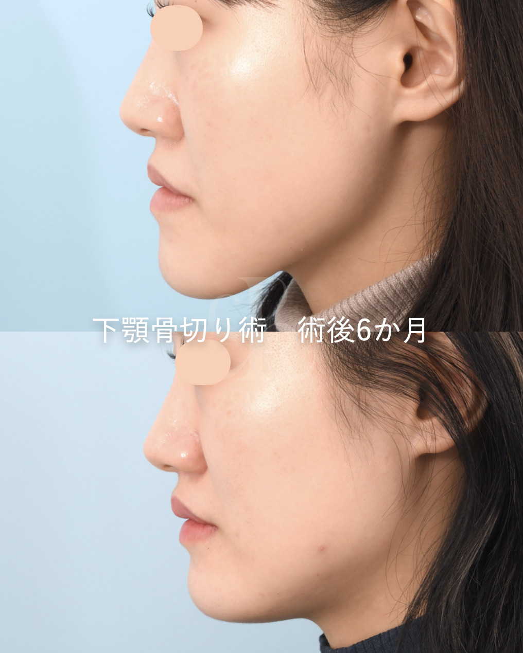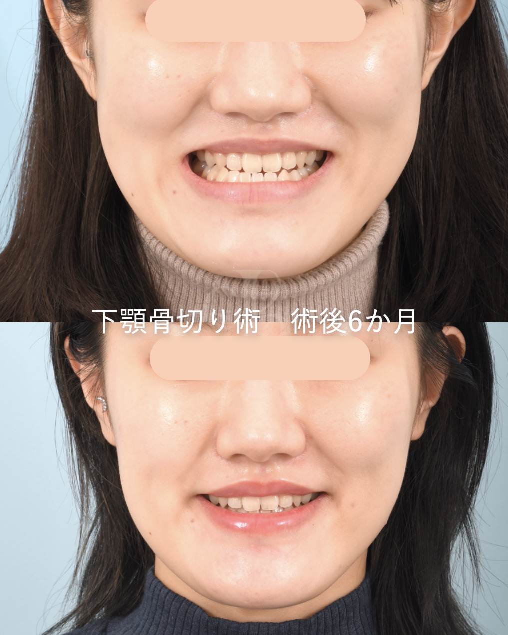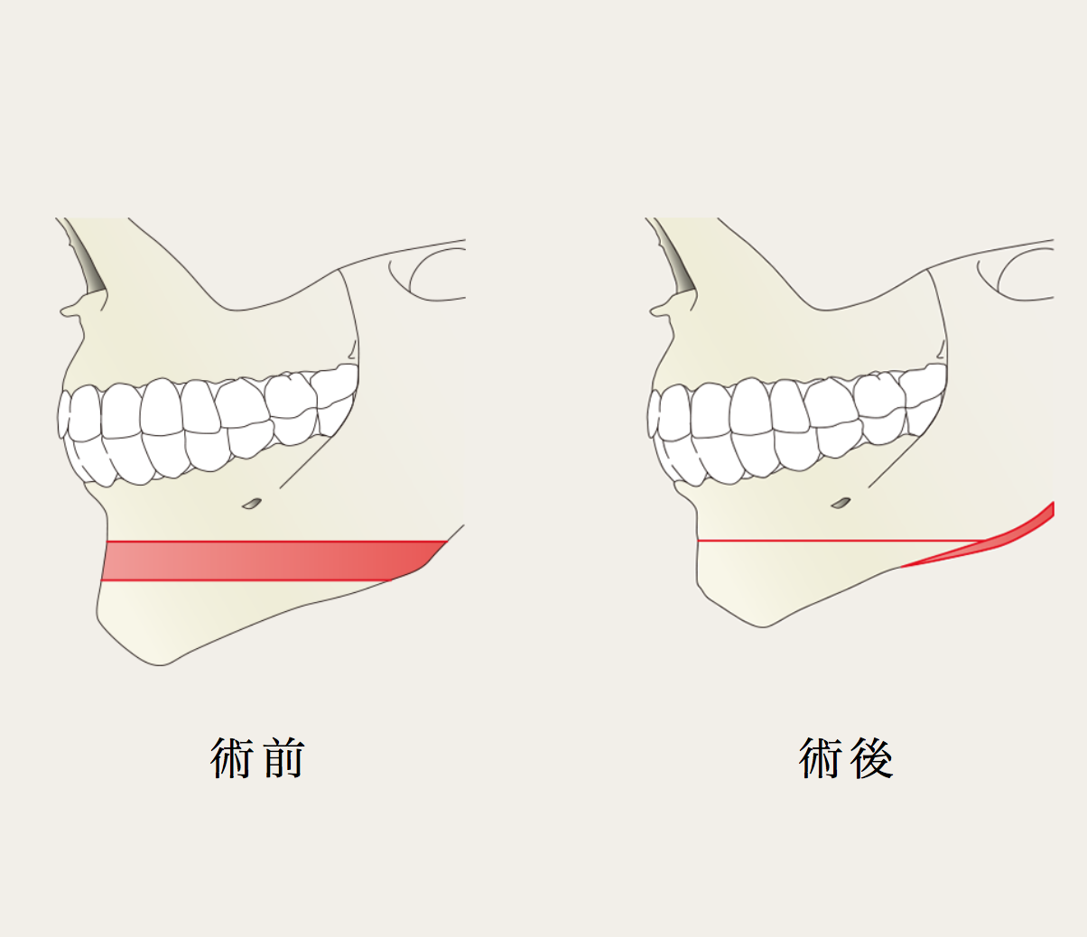 あご先だけでなく下顎全体を移動させる術式です。後ろに下げたり回転をかけることであご先のしゃくれ感を改善することができます。オトガイ形成よりも変化は大きくなります。適応は反対咬合などかみ合わせが合っていない場合です。もともとかみ合わせがぴったりあっている方は適応になりません。術後はかみ合わせが変化するため、術前、術後の矯正治療がほとんどの例で必要になります。