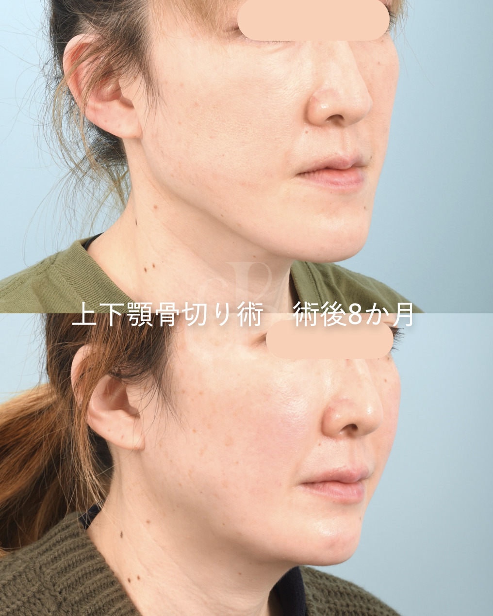 上顎、下顎をそれぞれ移動させて適切な位置に固定する手術です。かみあわせが合っていても合っていなくても適応できるため最も自由度が高い手術になります。面長感、あごのしゃくれ感などを大きく変化させることができます。オトガイ形成を併用することでしゃくれ感を完全になくすことも可能です。年齢制限はありませんが、30代以上でしゃくれ感、面長感を改善させるような骨切り術では、術後のたるみ(皮膚の余り感)が必ず生じるため、アフターケアとしてのたるみ治療を検討する必要があります。ハイフ、フェイスリフトなどがよい適応です。