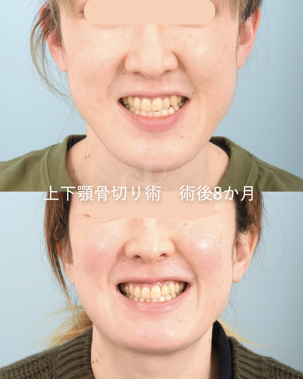 「上下顎骨切り術」または「下顎矢状分割骨切り術」いずれもよい適応と考えられました。左右差やあごの前突感を完全に解消するには上下顎骨切り術がよいことを説明のうえ治療法をご自身で選んでいただき「下顎矢状分割骨切り術」での手術をおこないました。術前矯正をほとんどおこなわない自由診療の「サージャリーファースト法」でおこなっています。